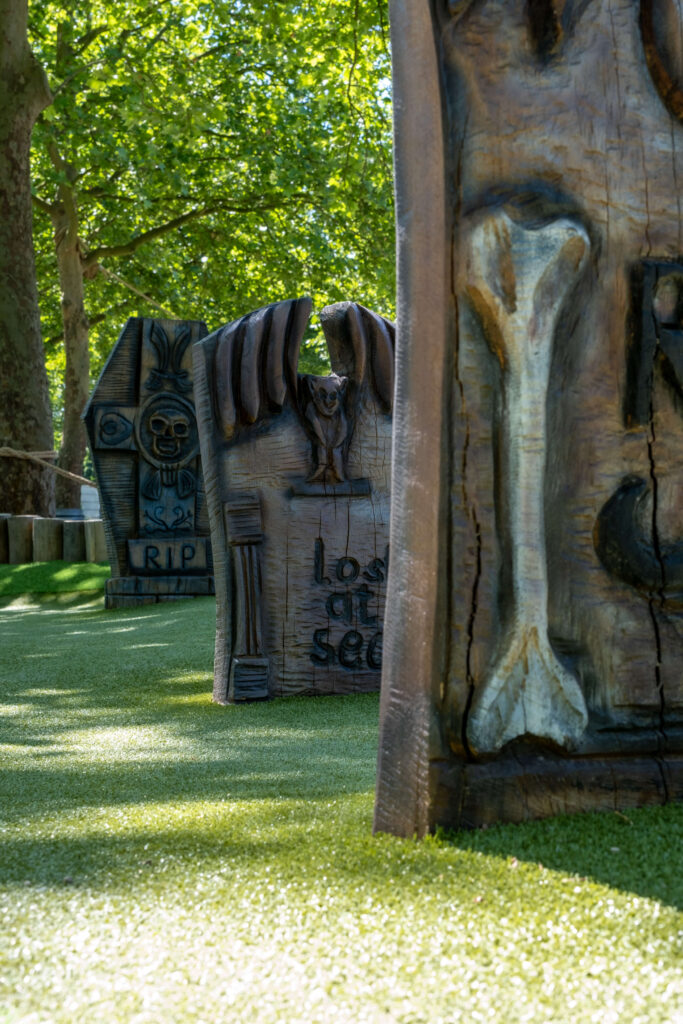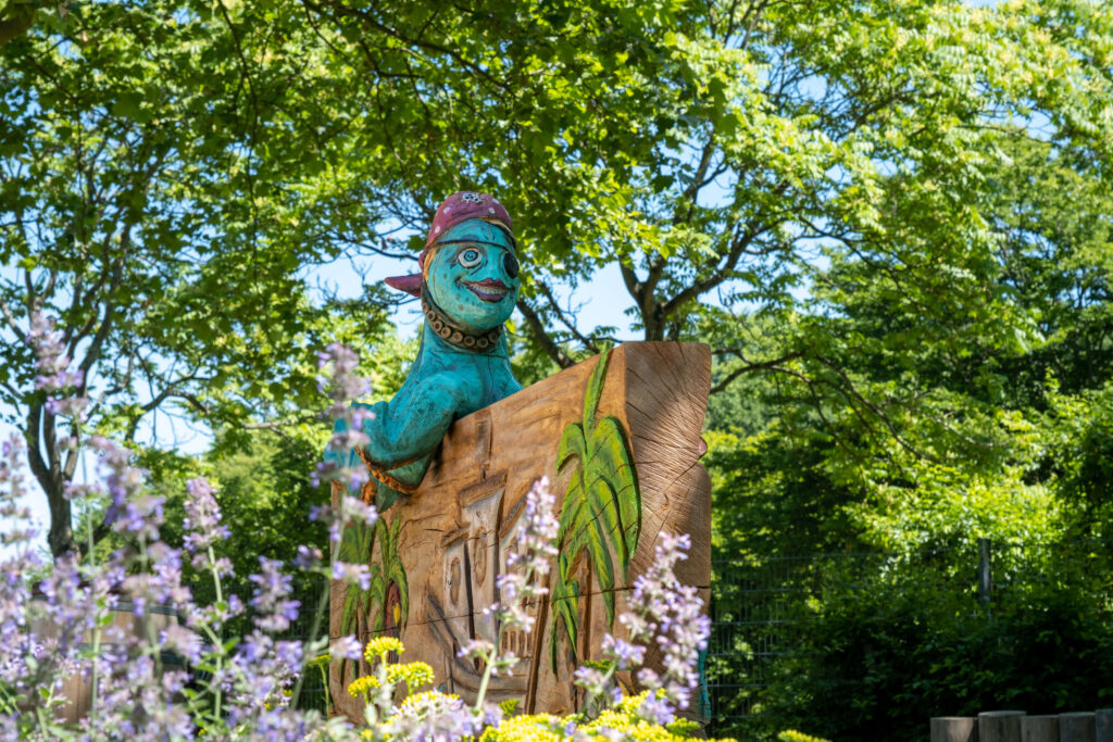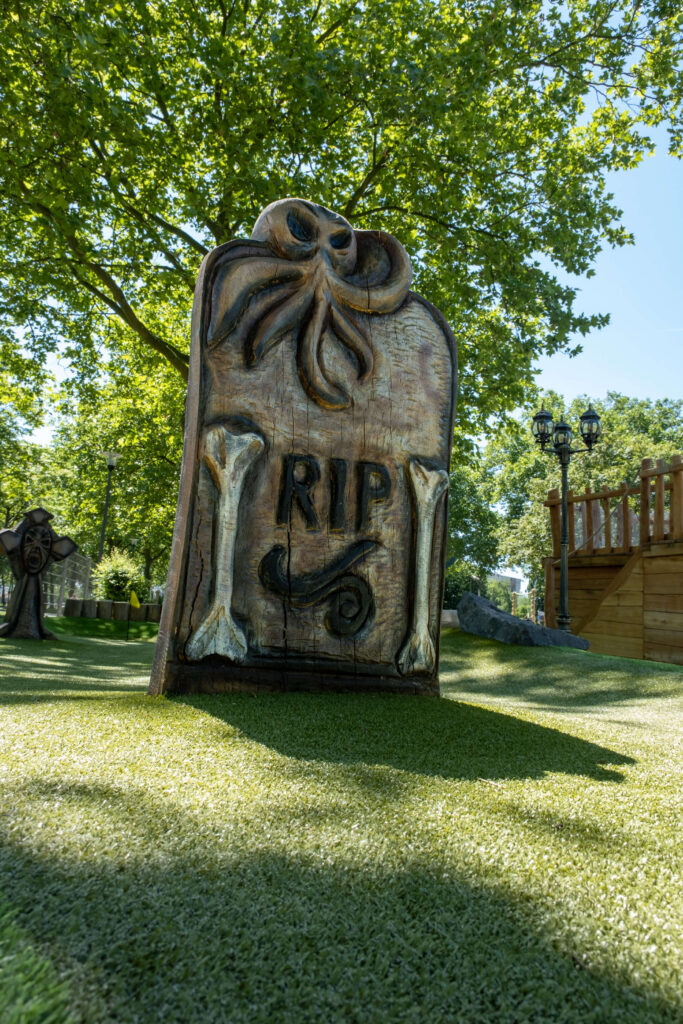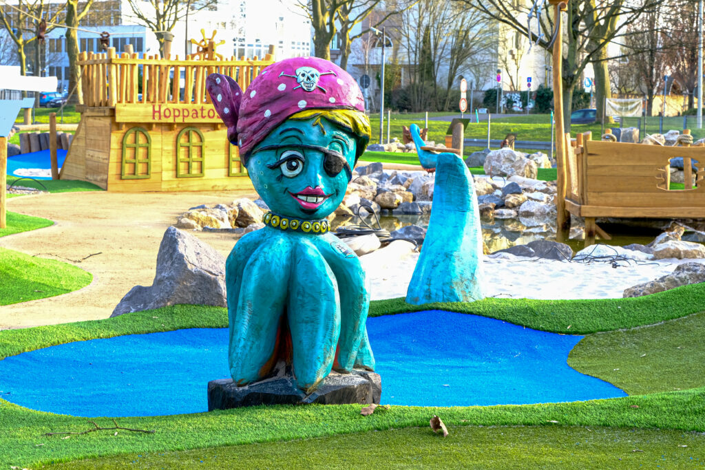 Mitten auf der Minigolfanlage und direkt vor dem Sandstrand befindet sich ein Schiffswrack – die Hoppetossa! Wie kommt es in die Rheinaue? Gut, dass unser Maskottchen, die Krake Käthe Euch die spannende Geschichte der Hoppetossa vor Ort auf den Bahnen erzählen kann.